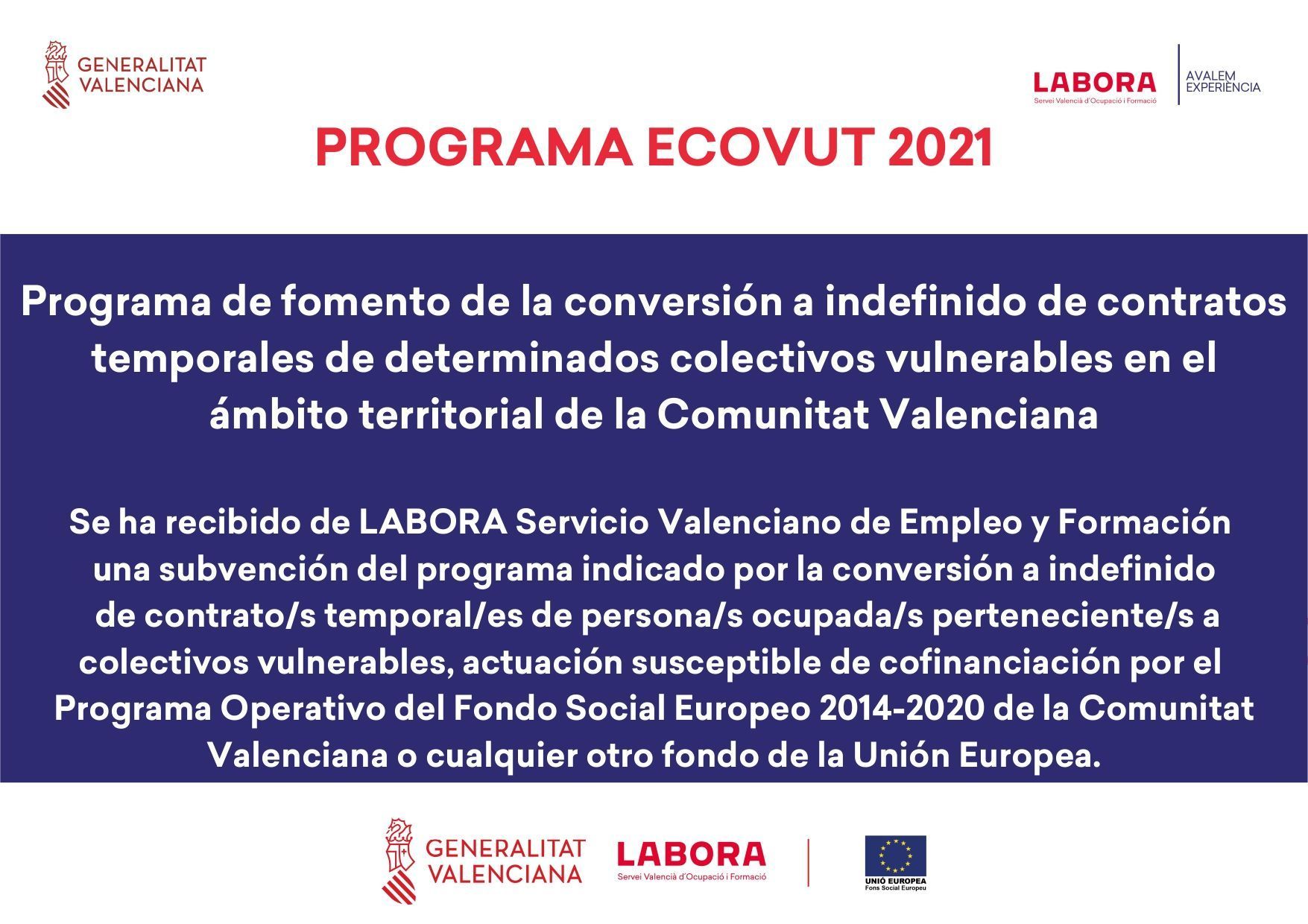 ECOVUT2021 tiene por objeto la concesión de subvenciones para fomentar, en el ámbito territorial de la Comunitat Valenciana, la conversión a indefinido de contratos temporales de las personas ocupadas con contratos de carácter no indefinido que figuren inscritas como demandantes de empleo en LABORA Servicio Valenciano de Empleo y Formación hasta el momento de la conversión a indefinido de su contrato, que en el momento de la conversión a indefinido de su contrato temporal pertenezcan a alguno de los siguientes colectivos: